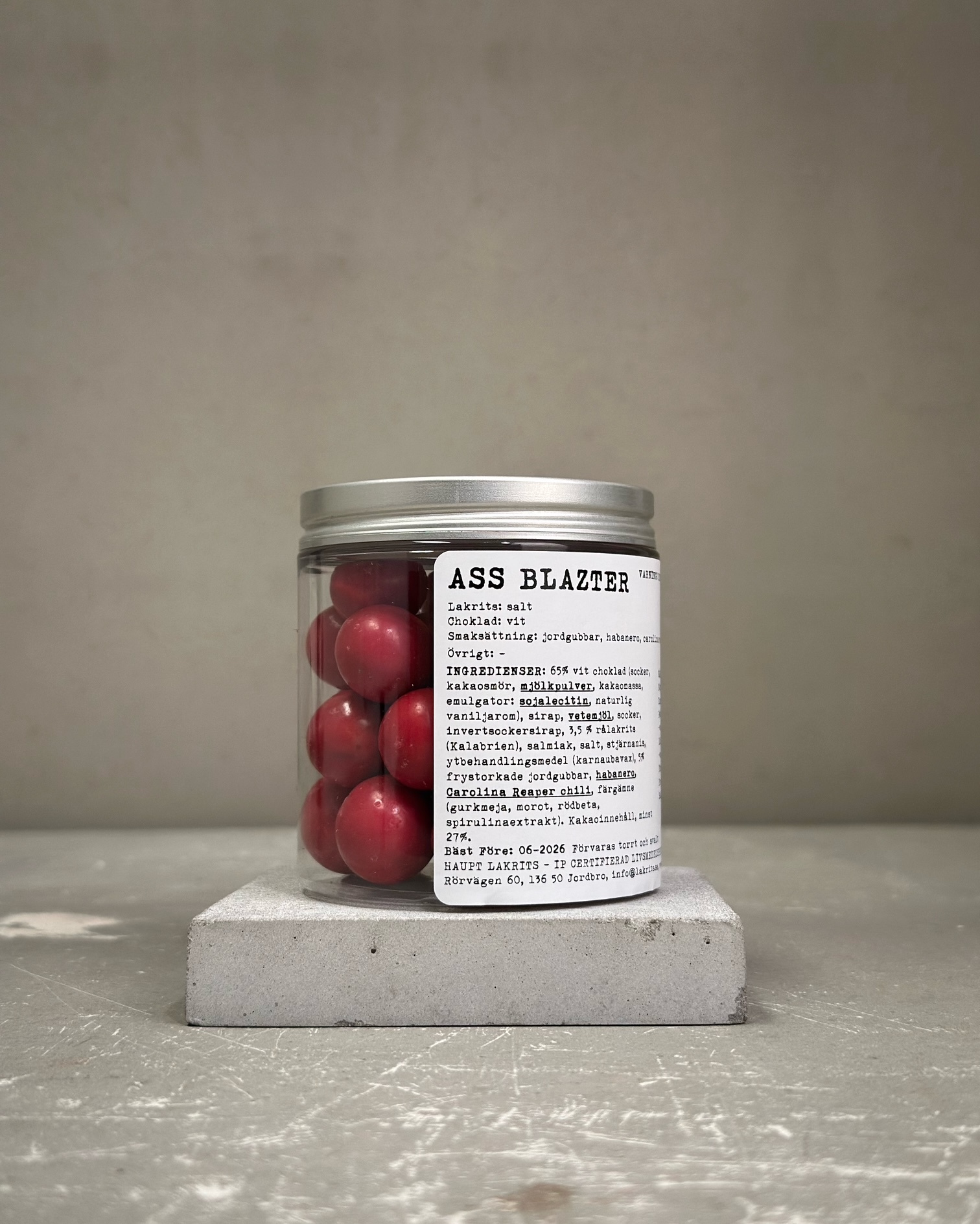 65% vit choklad (socker, kakaosmör, mjölkpulver, kakaomassa, emulgator: sojalecitin, naturlig vaniljarom), sirap, vetemjöl, socker, invertsockersirap, 3,5 % rålakrits (Kalabrien), salmiak, salt, stjärnanis, ytbehandlingsmedel (karnaubavax), 5% frystorkade jordgubbar, habanero, carolina reaper, färgämne (gurkmeja, morot, rödbeta, spirulinaextrakt). Kakaoinnehåll, minst 27%.